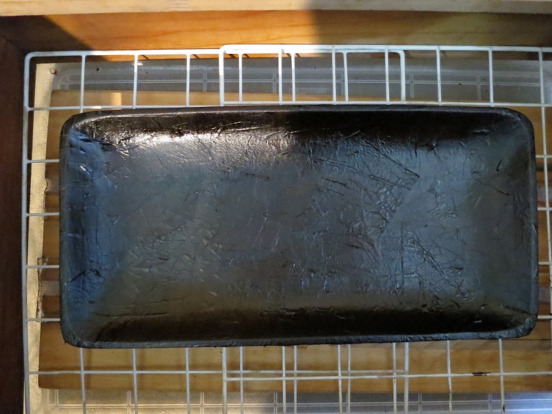 以前でしたら、シワが寄らないように工夫しながら貼って行き、乾いた後のシワは極力削り取って錆び付け漆で隠したものです。今回は、そのままにしておきます。