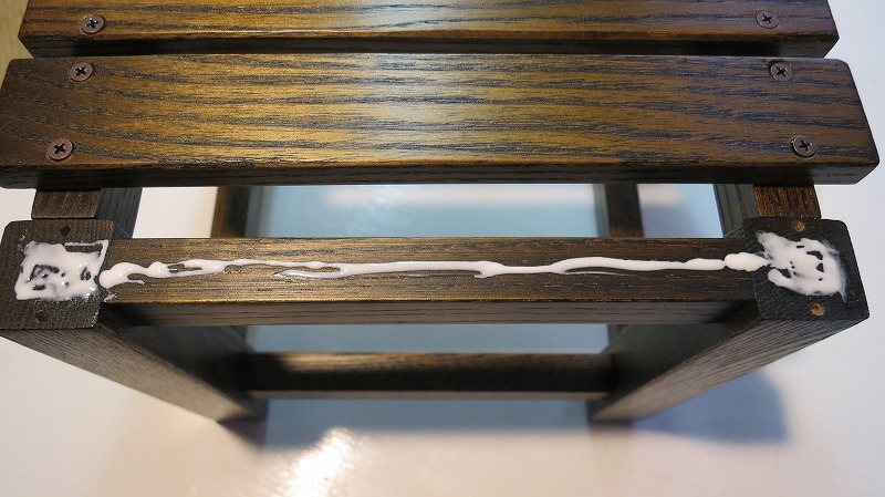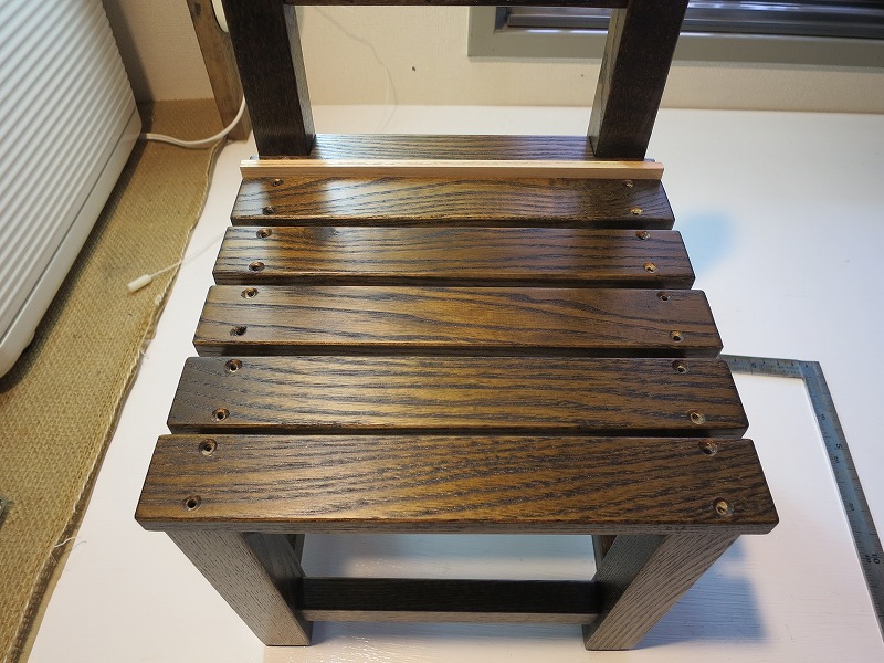 座面スペーサーをかましながら奥から手前に貼って行きます。ところが、一番手前の座面の取り付けビスがきわどいところに来るので、ドリルでもんで実質的にはネジ力をバカにします。