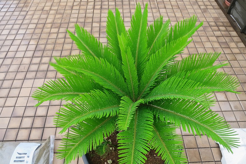 雨が止んだ時をみはからって外に出てみました。この天候の中で元気なのは、ソテツの葉っぱ。