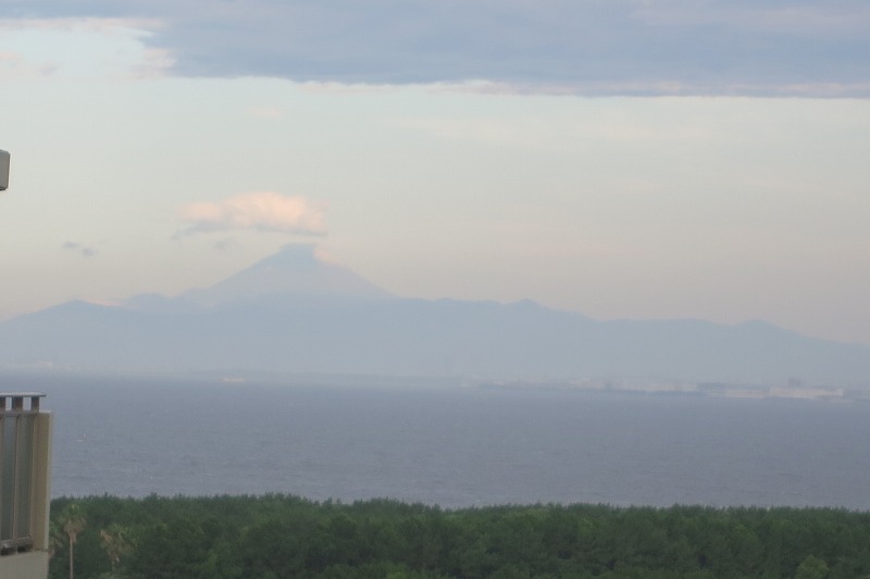 午前5時半、東京湾の向こうに富士山が見えます。朝飯前の仕事は、昨日の続きキャベツ・ランプの葉っぱを貼ります。