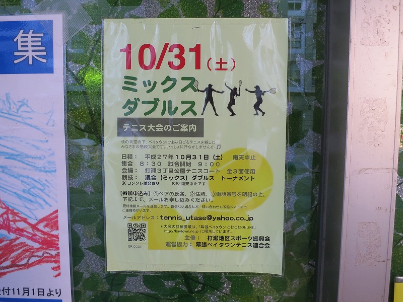 プロムナード街も人影ナシ。八百屋さんの掲示板にテニス大会とワインパーティのPRが、、。