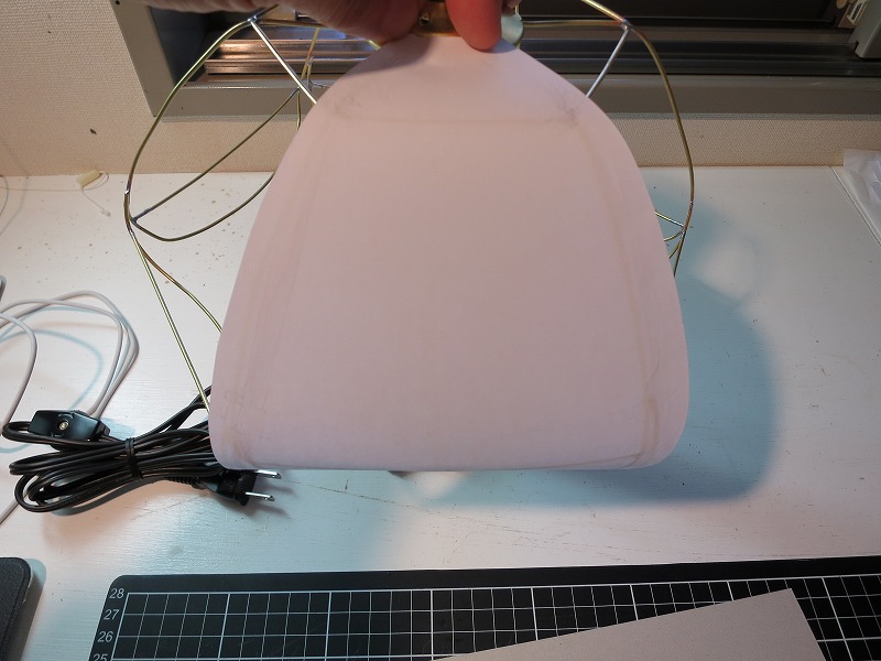 「行燈ランプ」のシェードに和紙を貼るのですが、これが、針金が細いので無理な力を入れると、グニャ~といっちゃいます。(和紙を貼り終わると剛性が上がります)