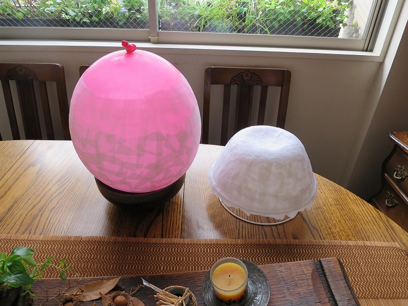 朝一番で昨日の和紙貼りの補修をします。ガラスボウルにはきっちりと貼ったつもりだったのですが、すき間だらけでした。バルーンは、リング口となる開口部の貼り足しです。