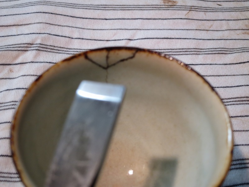 夕方帰宅してから、預かり物のお猪口の金継ぎを進めました。本来は、今日の行程で金粉を蒔くのが金継ぎなんですが、何も降りかけずに生漆だけでお化粧しました。