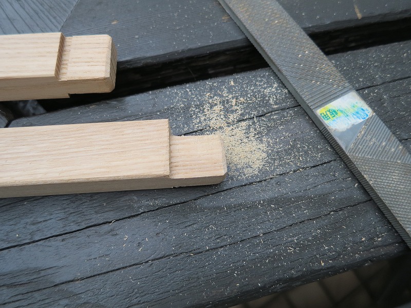 子供用椅子のホゾの嵌合の具合を確かめます。ほとんどの場合、垂直度が要調整なんです。