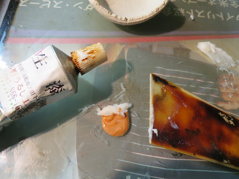 今回は、少々経費がかさんでも、やっぱり拭き漆仕上げにします。その前に、小皿の欠けツギをしなくてはいけません。ご飯粒+生漆+小麦粉をブレンドして、糊漆を作ります。