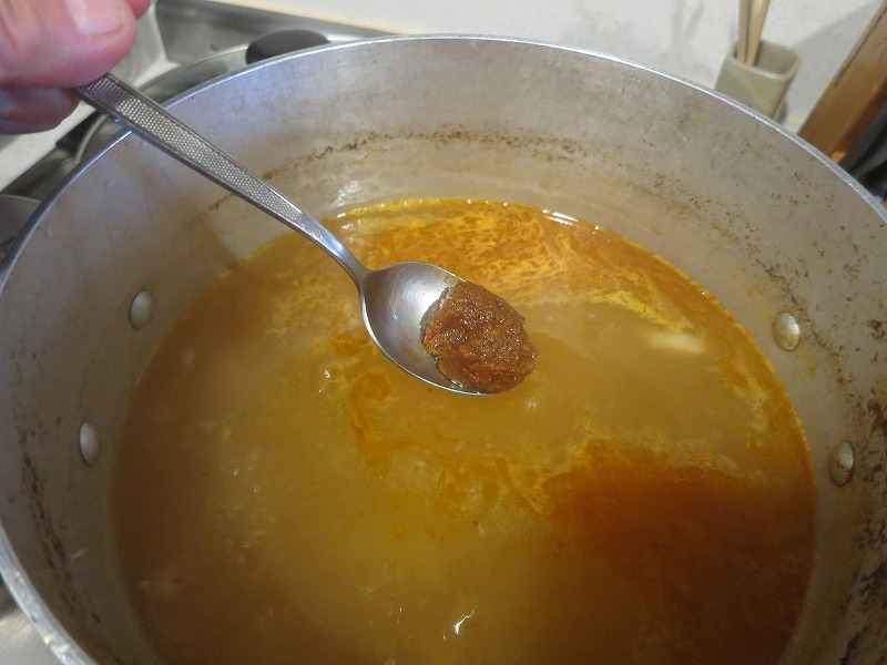 トムヤムスープの鶏ガラを取り出してトムヤムペーストとナンプラーを加えます。