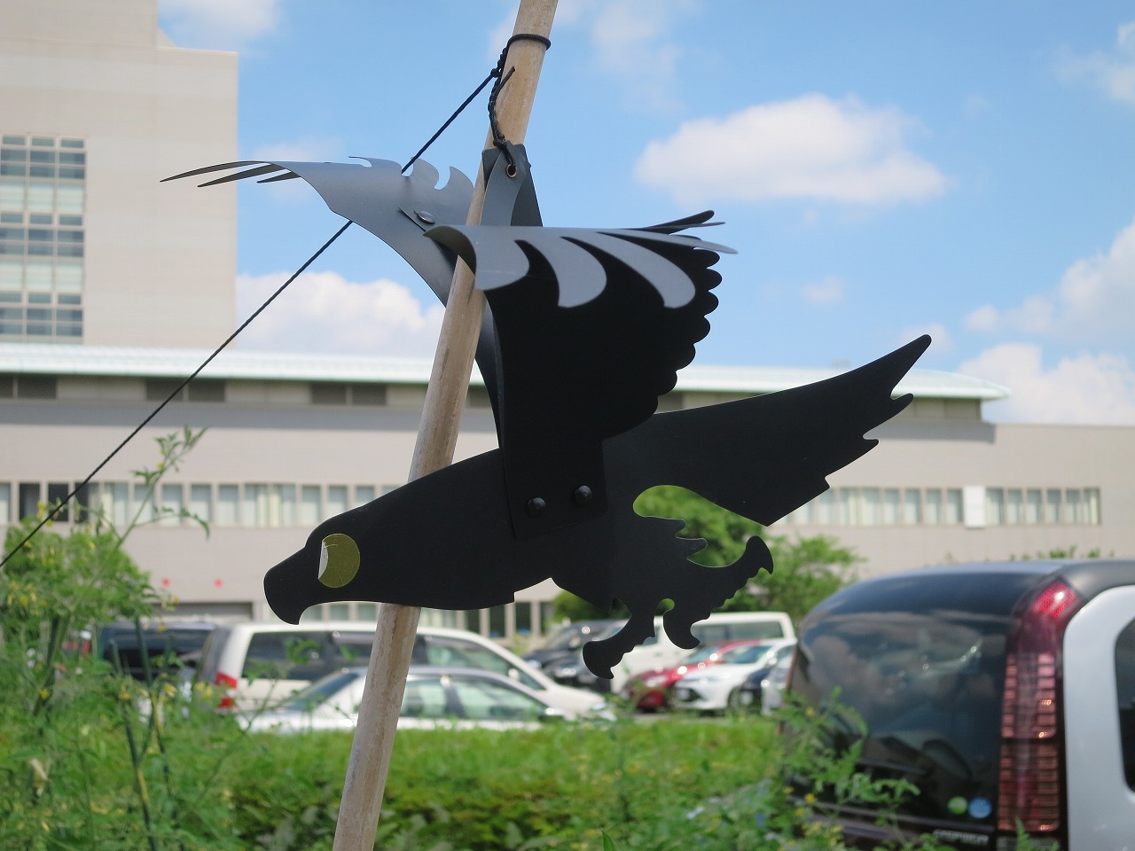 お墓に行く途中でカミさんの家庭菜園でトマトの収穫です。鳥はカラスを追っ払う案山子です。