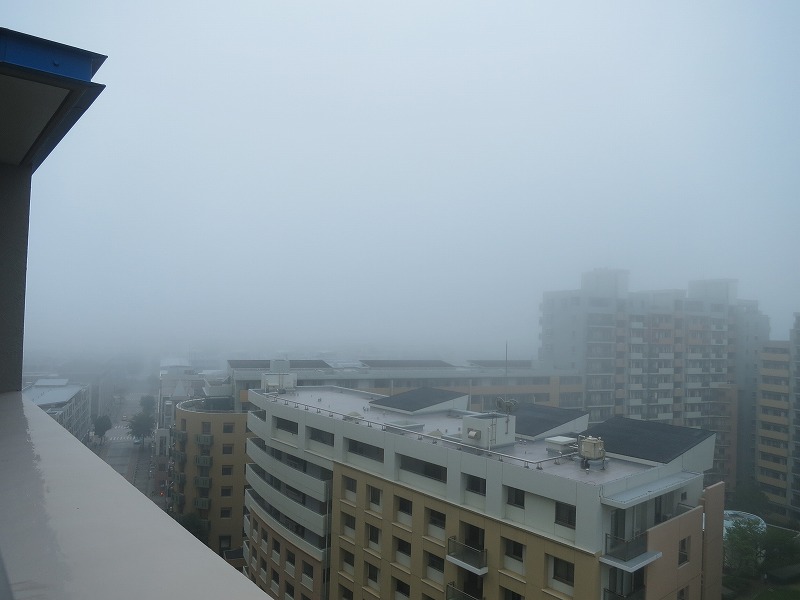 午前6時半の空模様です。50m先は全く見えません。霧が晴れたら、ギラギラ太陽が・・・。
