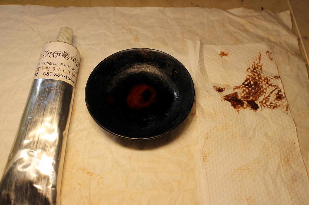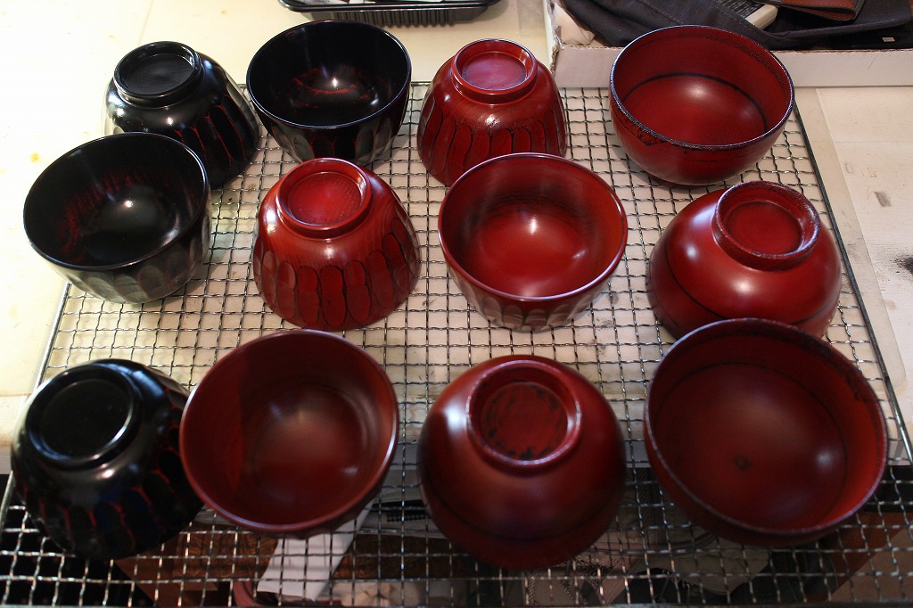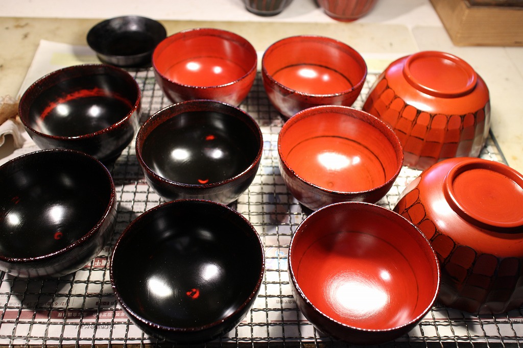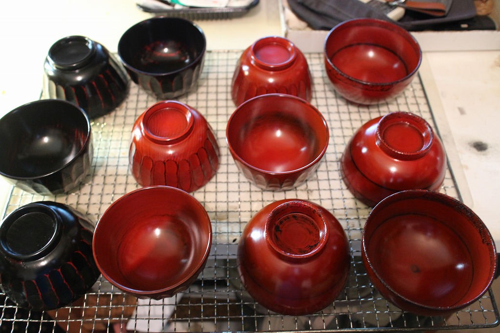 漆器問屋さんから出来合いを仕入れて、私流に仕上げて(塗り足して)店先に並べます。今回は、根来塗(黒地の上に赤を塗って研ぐ)&曙塗(赤地の上に黒を塗って研ぐ)お椀を中心にしました。まず上塗り1回目、次伊勢早漆による拭き漆です。