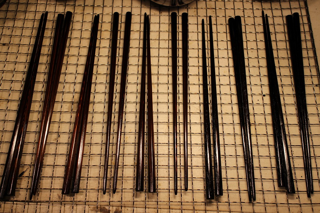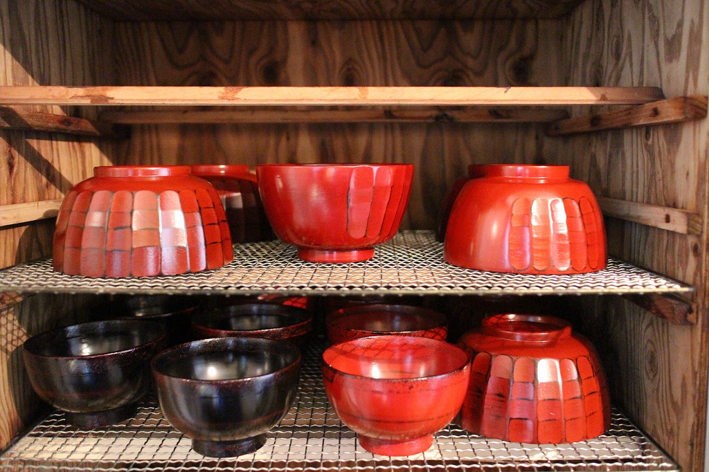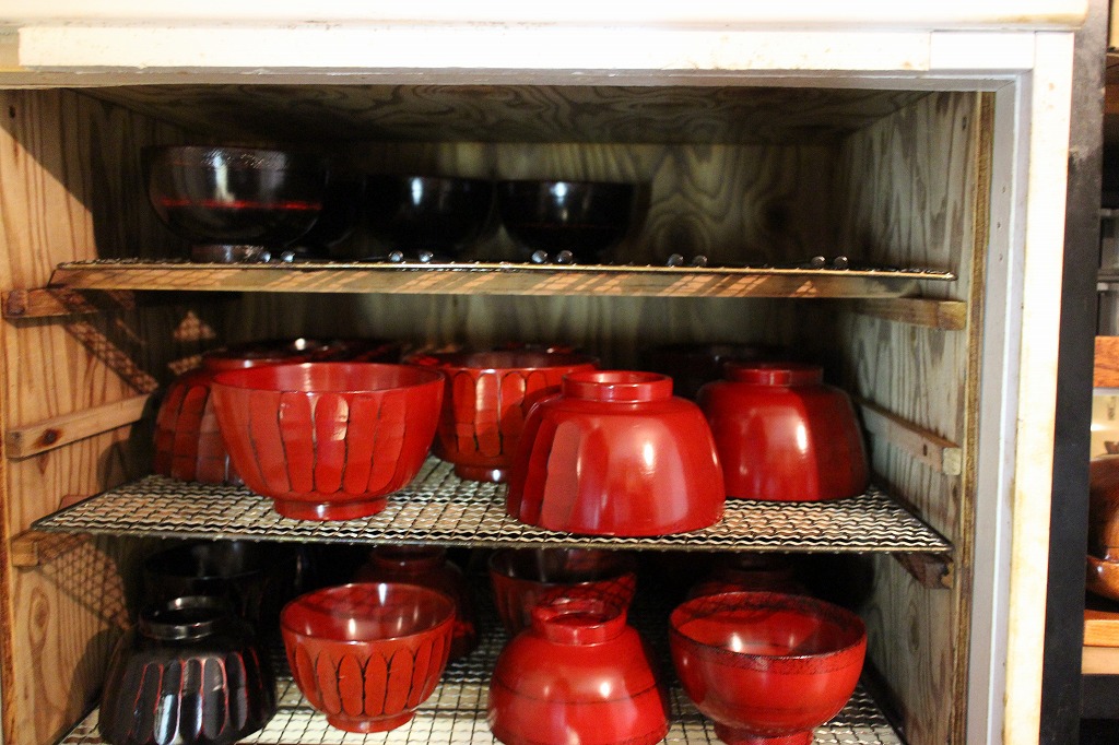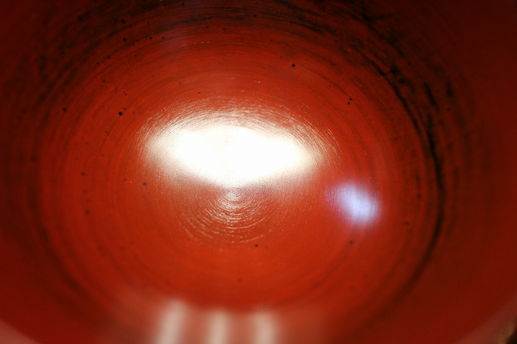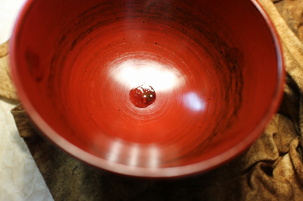 漆器問屋さんから出来合いを仕入れて、私流に仕上げて(塗り足して)店先に並べます。今回は、根来塗(黒地の上に赤を塗って研ぐ)&曙塗(赤地の上に黒を塗って研ぐ)お椀を中心にしました。まず上塗り1回目、次伊勢早漆による拭き漆です。