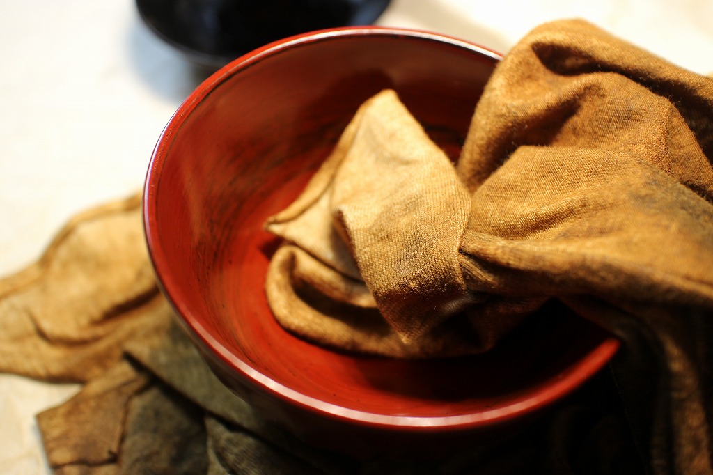 上塗りが乾いたら、大椀類の2度目の上塗りと、布袋型椀の上部の麻布の折れ曲がったところに漆を盛り付けます。これは口当たりを良くするためと布地を丈夫にするためです。