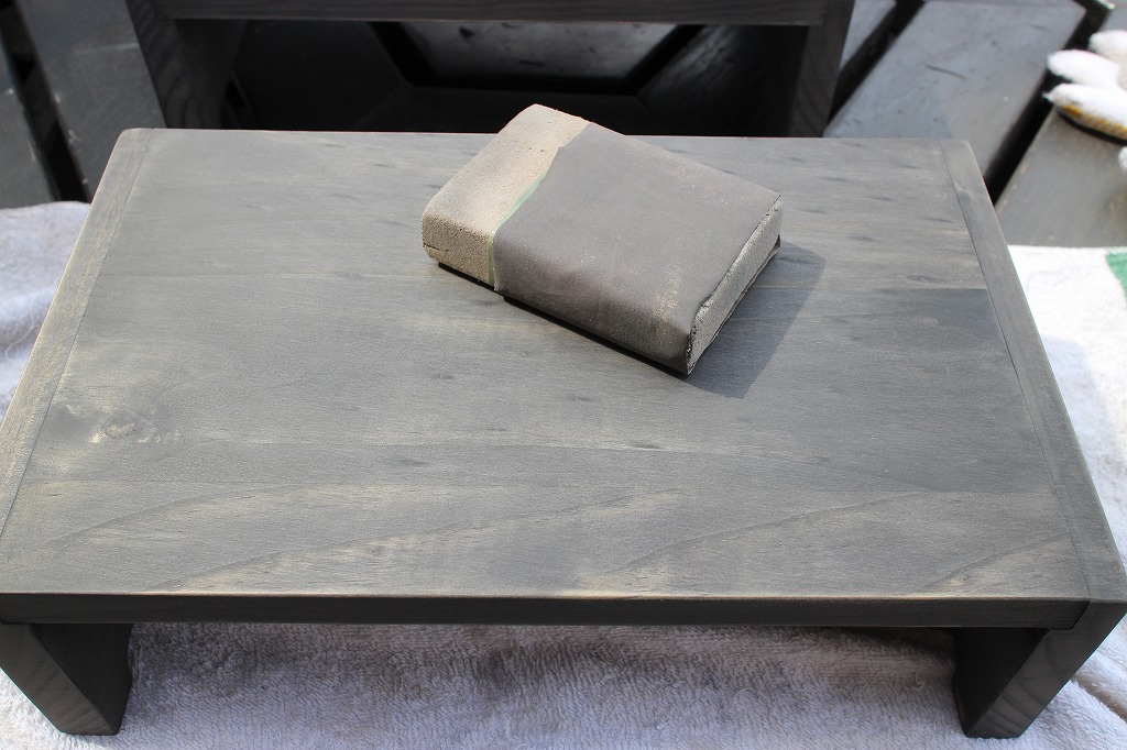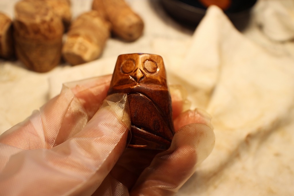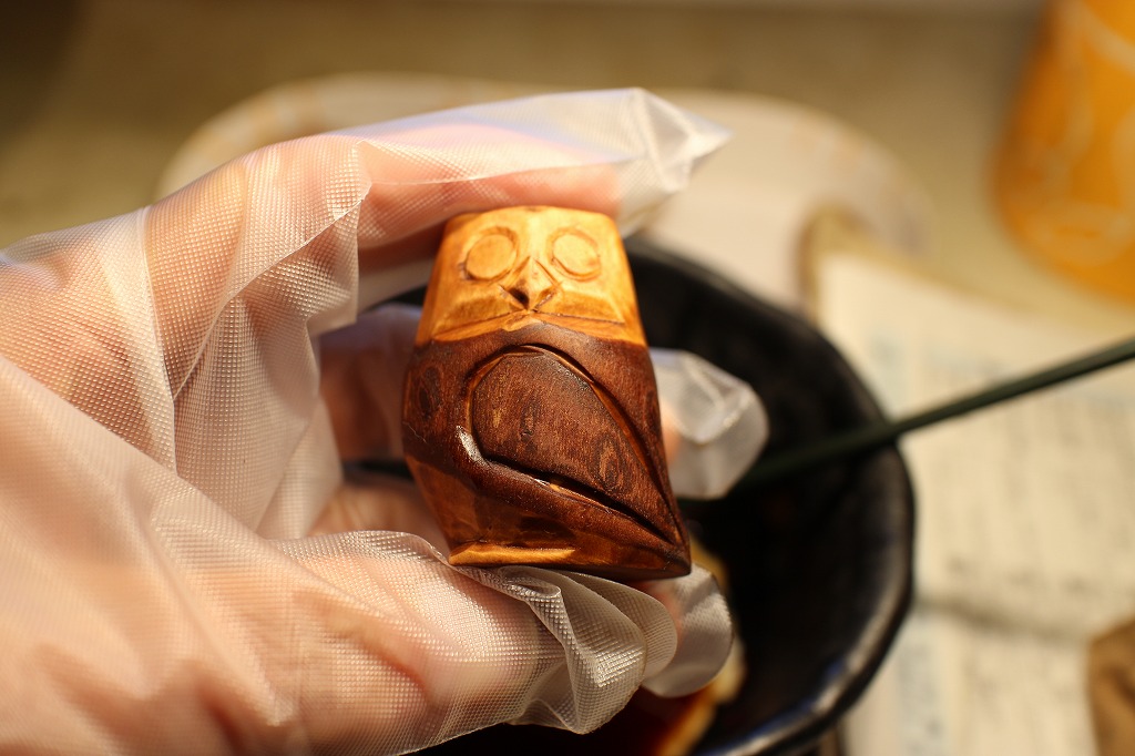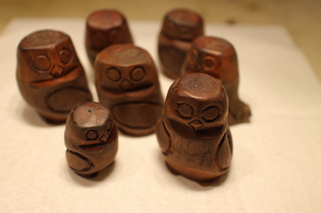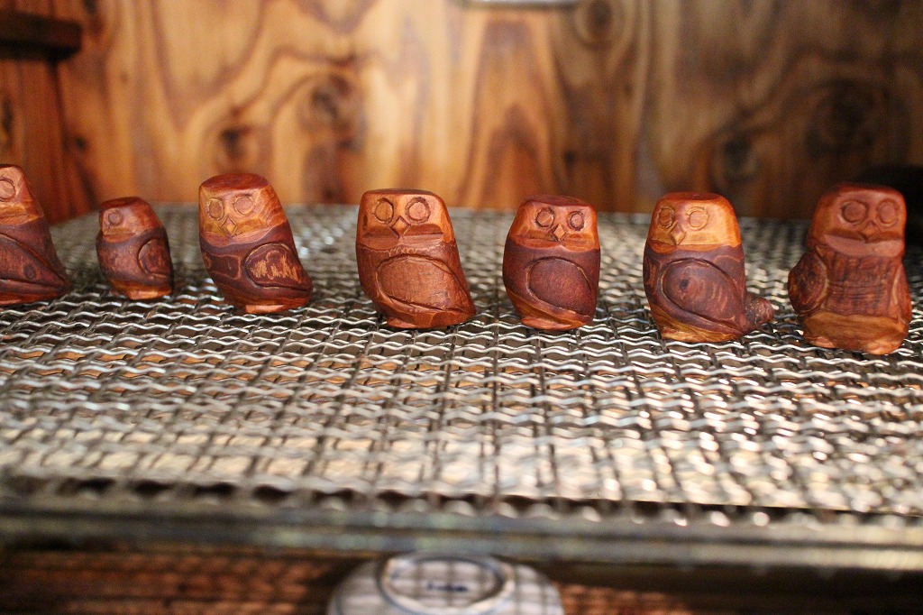 ②フクロウの彫り物は手持ちの素材7つを全てをオーソドックスな生漆の拭き漆品とします。