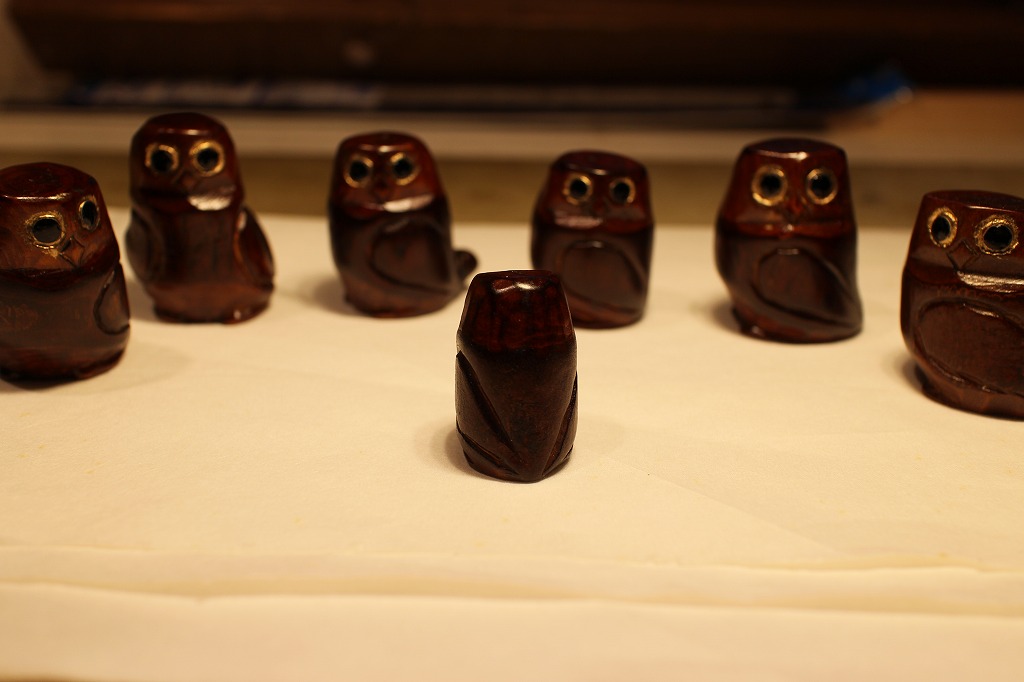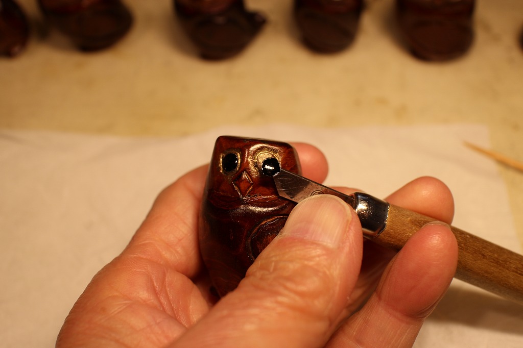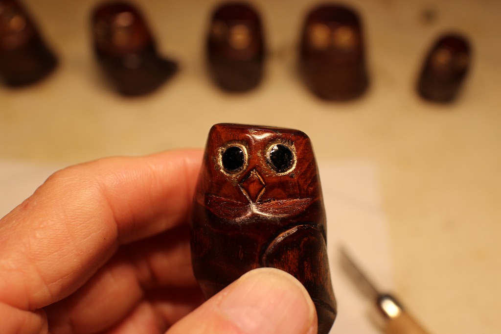 ①「春の工芸品まつり」の展示品作りの最終段階です。フクロウの目の入れ方を紹介します。