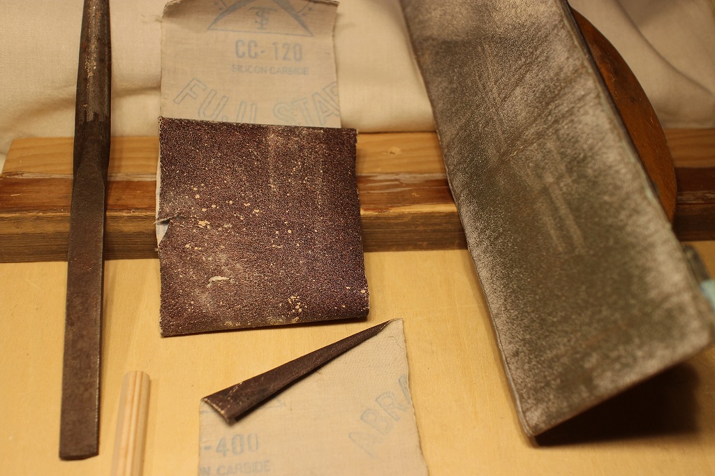 今日は雨模様。外では作業できないので室内の作業台の上で中仕上から最終仕上げまでやっちゃいました。道具は、金ヤスリ・#120/#240/#400のサンドペーパーと手元に掃除機です。