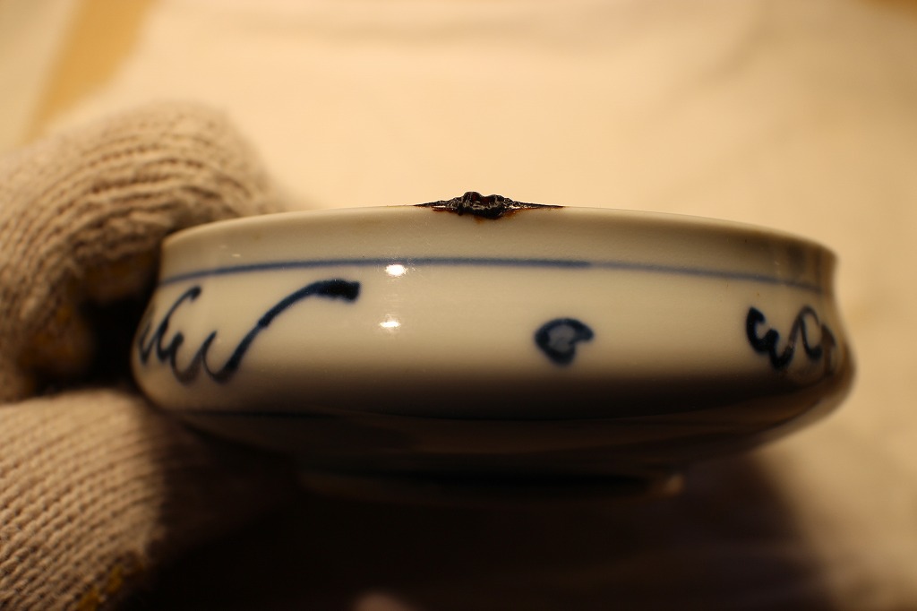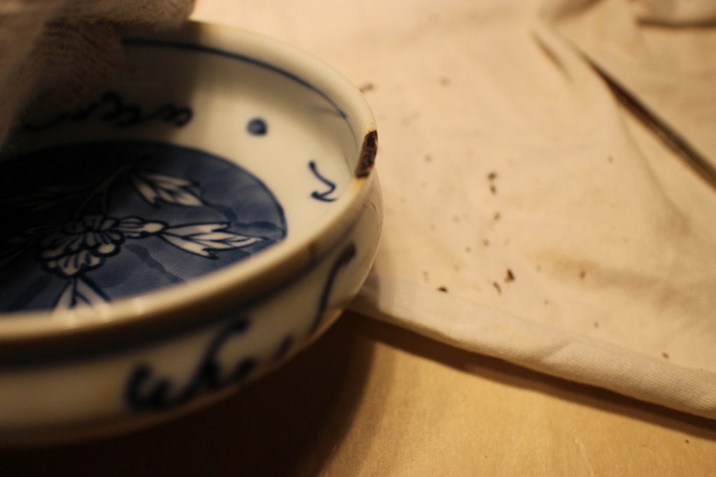 前の記事稿の最後の画像は預かり物の青磁器の欠けた部分に漆が盛り上がったところです。