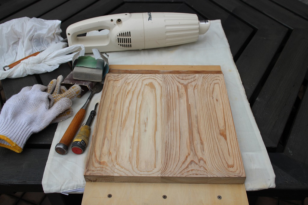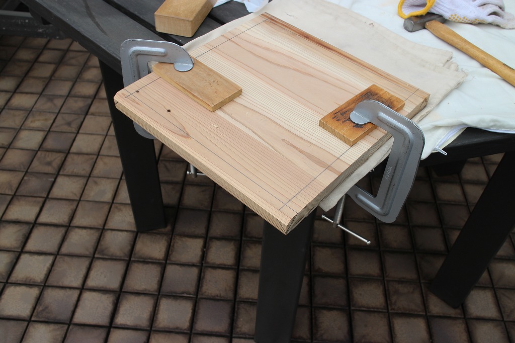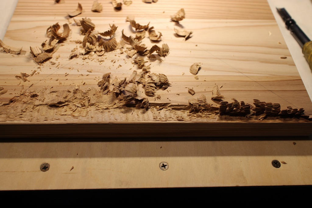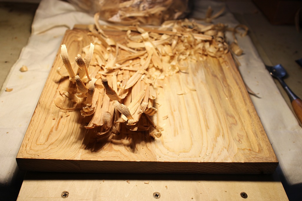 30cm×30cm×t25mmの厚材です。表面を彫り下げるのに正目に直角にノミを入れていきます。