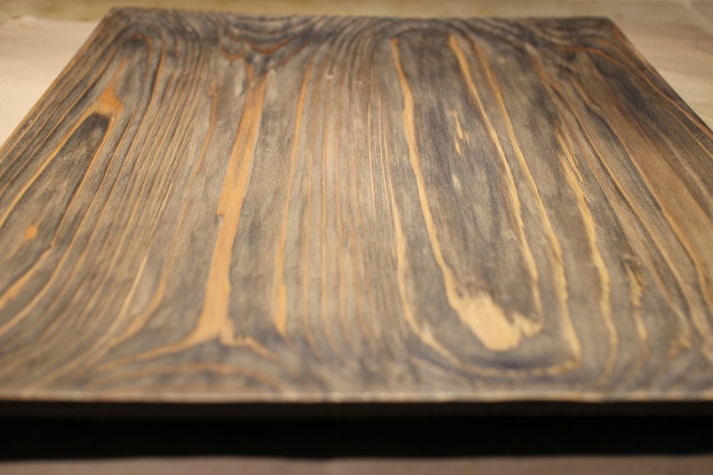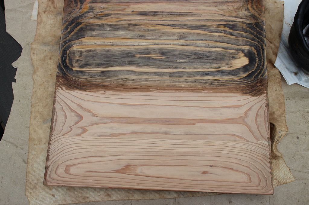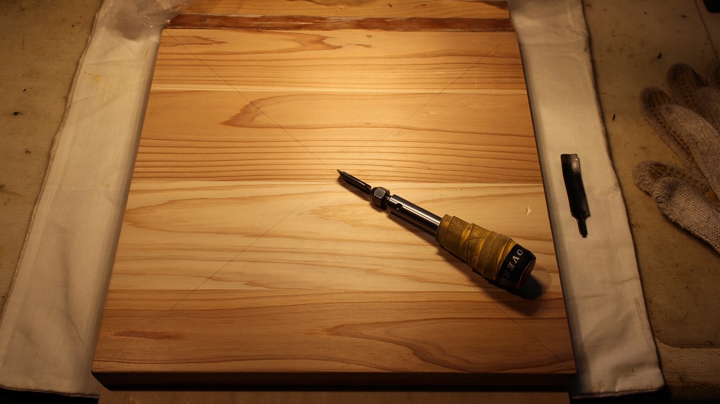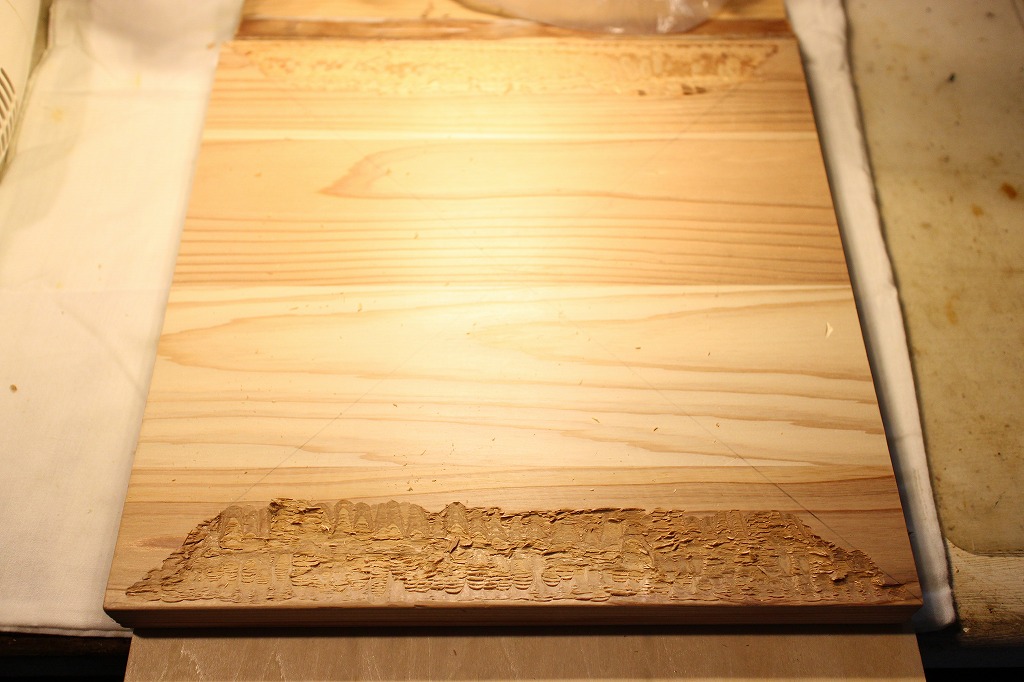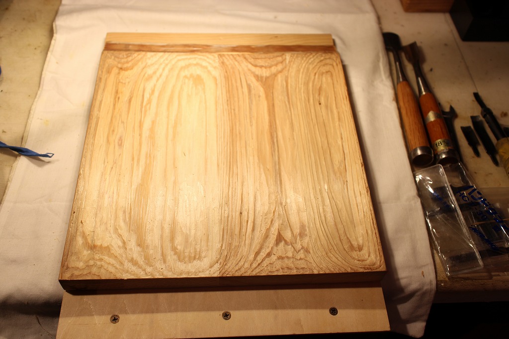 30cm×30cm×t25mmの厚材です。表面を彫り下げるのに正目に直角にノミを入れていきます。
