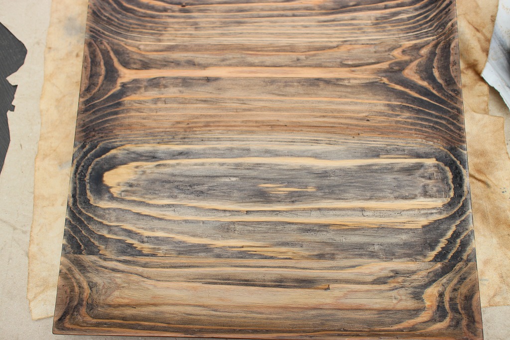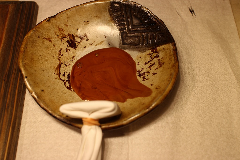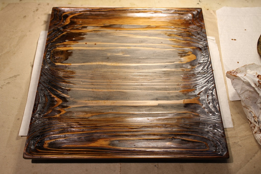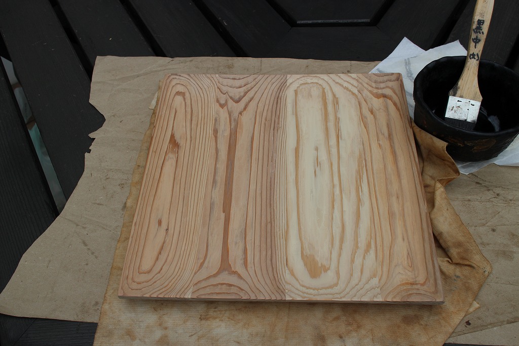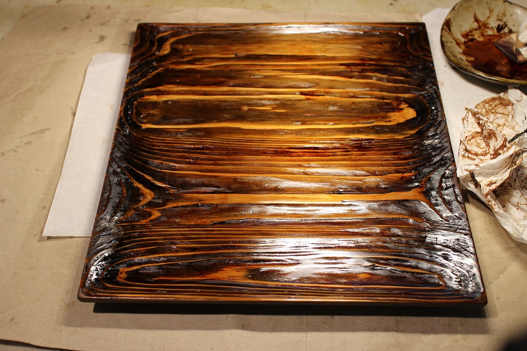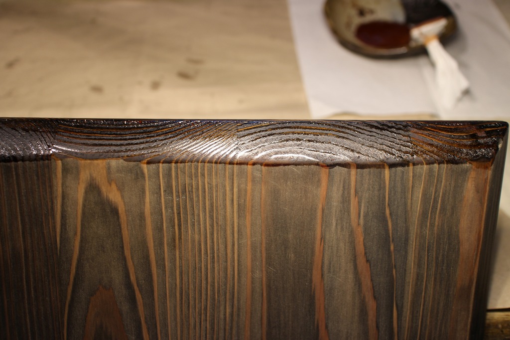 塗りは黒中漆の木地固めから⇒生漆の上塗りです。ささくれた部分には二重に塗り重ねます。