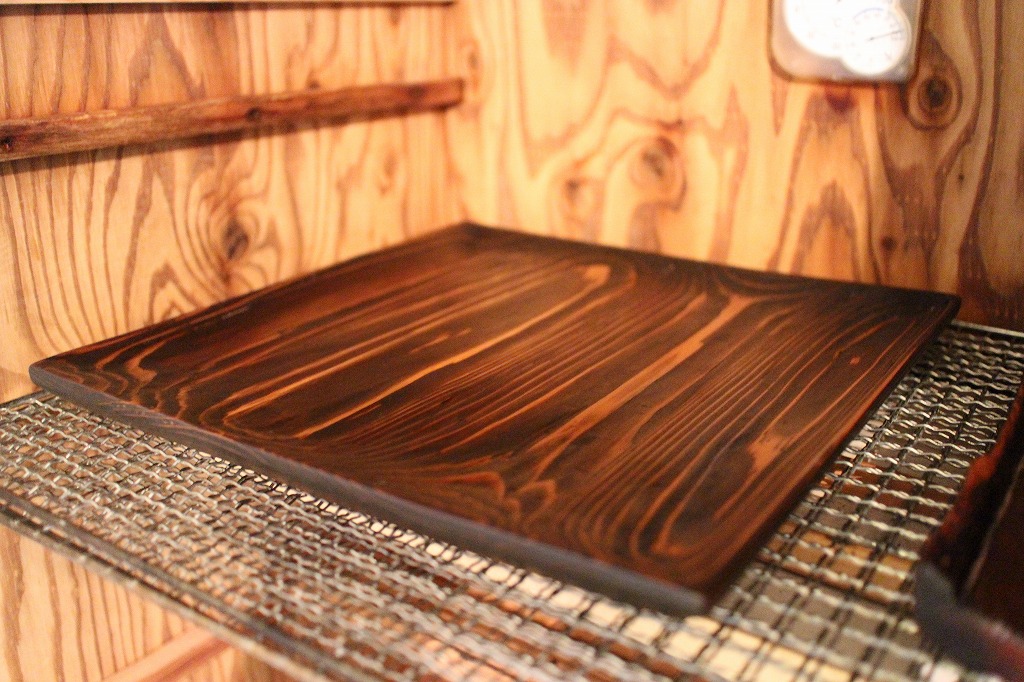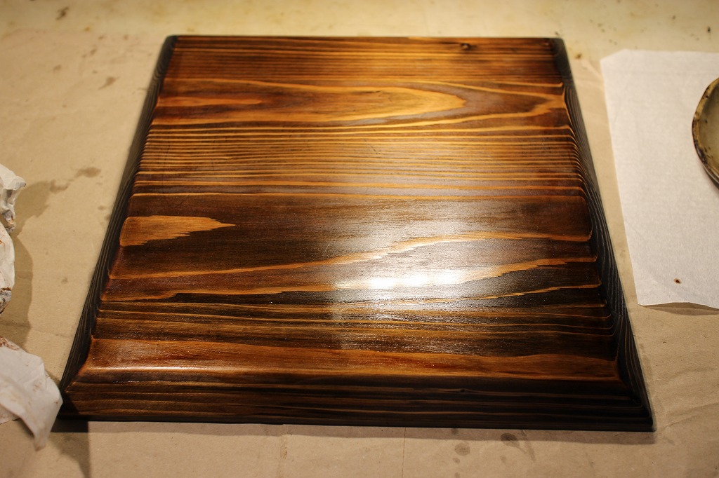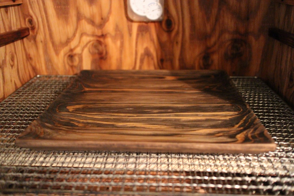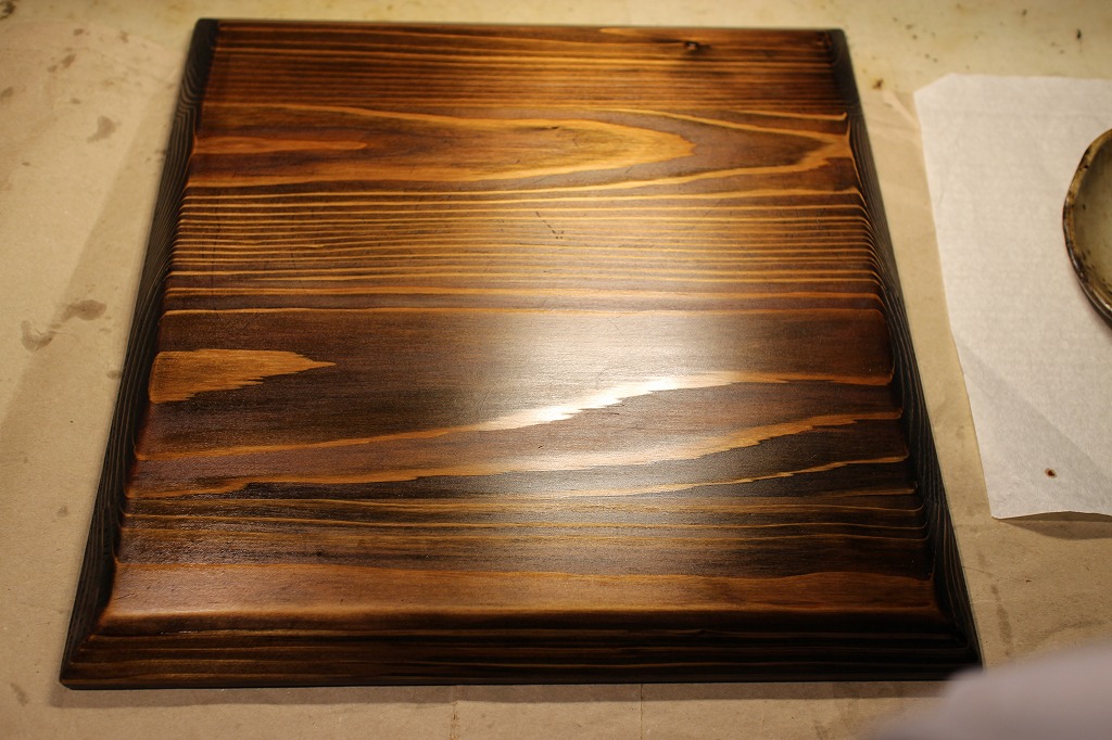このところ一週間に一本くらいのペースでアップしています^^;。ボチボチ作っては漆を塗っています。今回は2年前に仕入れた杉の厚板合板が一枚残っていたので、角皿を作っています。